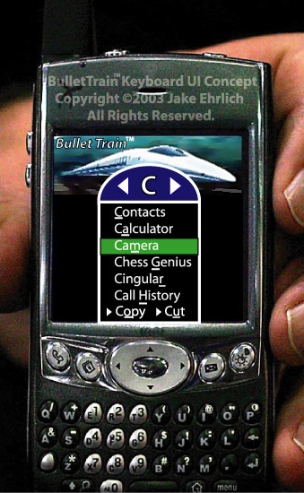 After I had my detailed preview of the Treo 600 I left two copies with HS that detailed my BulletTrain keyboard shortcut UI enhancement (as seen below) but did not hear back from them. I decided to contact Jeff Hawkins and I sent him a copy of the BulletTrain for the Treo 600 brochure. Jeff agreed to meet with me and we discussed my ideas. The upcoming text and pictures are from the original brochure I sent Jeff and the presentation I gave him in person: |