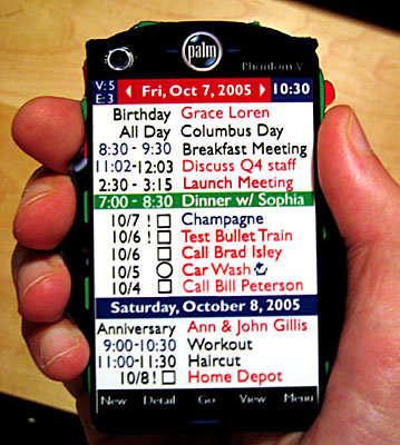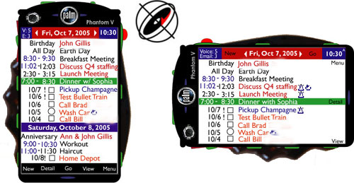 I have always believed that everything that can be digital will be digital. I thought of all the things that I would like my handheld computer to be able to do. Basically in the not so distant future I want to be able to leave my home with just my handheld computer and a pair of sunglasses. No more home keys, work keys, car keys, garage door openers, wallet, cash, credit cards, business cards, receipts, phone, laptop, calculator, etc. The list goes on and on and on. In order for the Phantom V to be a highly effective tool it needs a serious screen with at least 16 bit color depth and a half-VGA 480x320 OLED (Organic Light Emitting Diode) screen. I started experimenting with different form factors but concluded that the ultimate screen size had to have a 16x9 or 16x10 aspect ratio. The following images illustrate how I envision the Phantom V looking and working. Surf the web the way it was meant to be surfed. Look at Spreadsheets the way you should be able to. Picture above is the Phantom with my drivers license. Pictured above is a credit card transaction screen. This would occur via Bluetooth. Replace your car keys, home keys, work keys and garage door opener. Send and receive business card info along with a digital business card image. The Phantom V has a video camera on the front and back so you could simultaneously record yourself and a person you are interviewing or use it for video conferencing. Watch a movie. Watch a news program that you recorded on your computer hard drive. Watch an episode of you favorite TV show that you recorded on your computer hard drive. The Phantom V has a version of the BulletTrain Desktop Dashboard that runs directly on and from your Phantom. The BulletTrain Desktop Dashboard is a Desktop PIM application that supplants Palm Desktop and will be discussed and illustrated in Part 3 of this series. Because the Phantom has Bluetooth and a Bluetooth USB adapter it would allow you to go to a friends house and access your Desktop Application via Bluetooth and run it locally on your friends computer in a browser window. This would avoid your friend from having to have any special software on their computer. With a Bluetooth TV adapter you could hook it up to a TV as well. Why a 480x320 Screen Having a 480 x320 screen would allow you to see everything with photographic clarity. I believe the ultimate handheld computer really should replace the need to carry around a brick-like laptop. I would also incorporate sub pixel rendering to make type that much clearer and easy to read in small sizes. With half VGA and sub pixel rendering it would allow you to utilize digital tickets for events like a Rolling Stones concert, or airline tickets or even your passport. You could also view live video from remote web connected cameras so you could monitor an infant in a crib, children playing at daycare, you could even view who is ringing your doorbell and activate the buzzer to let them in. And then of course there are obvious things like using GPS (Global Positioning) to help you navigate on foot or in a car. You could also carry PowerPoint presentations with you and run them wirelessly from your Phantom V as well as have your a huge music collection of MP3 files to listen to in your car. And speaking of music, you could use your Phantom V to remotely control ALL of your RF and IR components in your home. In order to do all of the things I mentioned above, Palm would need to manufacture their own chips instead of purchasing pre-fabricated chips. I think this is inevitable.