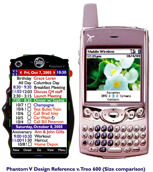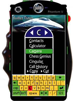I am a designer and as many of you know I recently had the opportunity to sit down with the inventor of the original Palm Pilot, Jeff Hawkins and share some of my thoughts on the future of handheld computing. Over the years I have owned many PDAs and I have always thought about ways to make them better. Prior to my meeting with Jeff Hawkins I had two weeks to prepare. I wanted to try to share as many positive ideas with Jeff on how to improve the future of handheld computing. I sat down and started designing. I am an advanced graphic designer and as I previously mentioned I had invested a great deal of time working on developing my UI design skills with the original User Interface for the Microsoft Pocket PC. Back from the Future I tried to envision the ultimate handheld computer! I though to myself, If I had a time machine and I could go to the year 2015 and see a Palm handheld computer, what would it look like? Would it have a Sony logo on it? How would it function? What features would it have? and most importantly, how many of the insights that I gained from using it would I be able to bring back to the present and incorporate into a model for the next generation of Treo due perhaps in late 2004 as a 2005 model? I was so excited to meet with Jeff Hawkins and I wanted to impress him so I really got into trying to design what I perceived to be a futuristic Palm-Treo-like device and in doing so unearthed what I consider to be close to the perfect form factor for a handheld computer. When I say perfect I mean that if it were any smaller it would be too small. I dubbed my device the Phantom V. George Bernard Shaw said "Some men see things as they are and wonder why. I dream of things that never were and wonder, why not?" I designed the Phantom V and all the BulletTrain components for myself. They represent the design features that I want and envision as a user. Many people have suggested that such a product is ten years away from reality. I disagree. I believe it could be real within a year. As you can see above the Phantom V is approximately two thirds the size of a Treo 600, yet it's screen is almost twice as big and it has a native resolution of 320x480 (half VGA). The futuristic thinking that went into the Phantom V is way, way outside the box. It is perfectly ergonomic with a hand-in-glove-like fit which makes it completely slip proof. Despite the fact that it looks like no other handheld computer and despite its otherworldly appearance it is designed as a very serious business tool. The Phantom V is an example of form flawlessly following function and it is built to last for years. It is not only waterproof but modularly upgradeable. It has two batteries, one in each side handle. It is designed to be able to be used by a left handed or right handed person. Despite the fact that I am right handed, Jeff Hawkins was holding it in his left hand and thought it was for left handed people—that is how ambidextrous and ergonomic it is. It is so small and ergonomically designed that you can access all the device buttons with just one hand. This includes the buttons on the top of the Phantom. The soon to be released Treo 600 has all the buttons on the front and no buttons on the side except a volume up and down button. I think this is a waste of space. The Phantom V has four buttons on the left side and three on the right. The Phantom V has three on-board cameras. One in front, one on top and one in the back. The Phantom uses your eyeballs for screen navigation and text entry as well as your unique retina eyeball signature for password protection. Instead of having a 5 way navigation button on the front, the Phantom has a bright red, 9 way navigation button located toward the upper right corner. Text input is achieved by the front camera which tracks you pupil movement. As you type, you look at different letters on the on-screen pop-up keyboard. As you navigate around looking at different letters the letter you are looking at highlights in red. To select it and type it in lower case you press the red 9 way navigation button in. To type capital letters you press the corresponding button located in the upper left hand corner. Please keep in mind that a device such as the Phantom V would have multiple text input methods. For instance you could use your finger, a stylus or Graffiti as additional input methods. In order to use your retina or pupil for screen navigation and text input the front camera would require a direct line of sight. So if you were wearing dark sunglasses it would not work and thus you would need additional input methods.